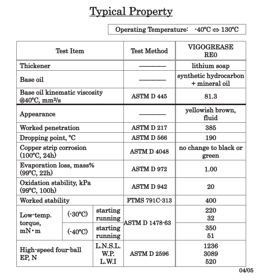VigoGrease RE0(Vigo Grease) 是一種具有優(yōu)異耐磨性的鋰基潤滑脂。它以烴油和精煉礦物油為基礎(chǔ),含有有機鉬化合物。VIGOGREASE RE0 可有效到達減速齒輪的精密潤滑點,從而提高效率并延長潤滑壽命。